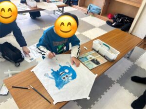 凧に描きたいキャラクターやデザインを決めて、下書きから黙々と取り組む子どもたち✏️