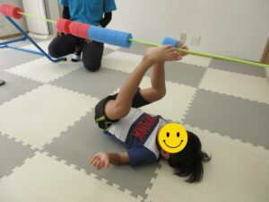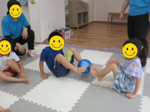 お友達に渡すのも受け取るのも大変でしたが、どうしたら上手に渡せるのか落とさないように集中していました。足の力だけでなく、足の指先から体全体を使って取り組むことができました!