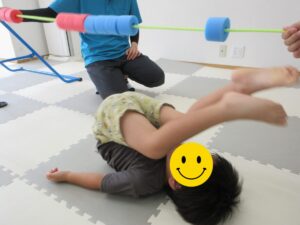 足の側面や足の裏を使ってPSを挟み、後ろに引っ張る動きです。お友達に勝負を挑みたいのになかなか掴めなくて苦戦する子ども達💦
