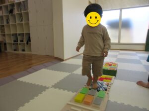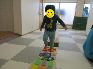 足の裏からの感触を楽しみながらしっかりと足元を見て歩いています。感覚過敏、感覚鈍麻など感覚に対しての刺激を取り入れることで触覚への反応に変化が見られてきます。このセンサリーマットは子どもたちに大好評の活動のひとつです!