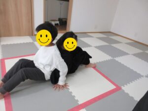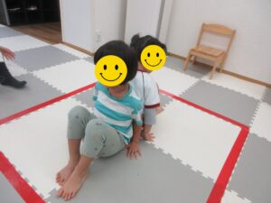 背中で押し合う動きはなかなか経験がなくはじめは戸惑う子どもたちでしたが、手足で踏ん張りながらしっかりと押し合うことができていました。背面へのボディイメージ、足腰の踏ん張る力、体幹、バランス感覚を養うことができました!